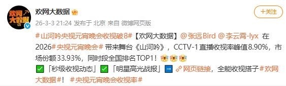 部分参考资料:2026央视元宵晚会CCTV-1官方回放|欢网实时收视监测数据:
